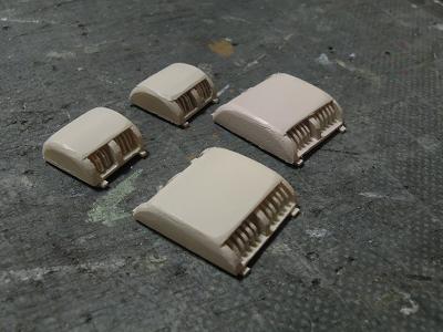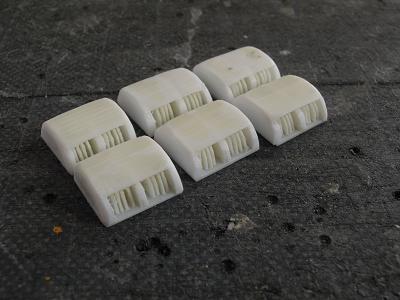 パーツ自作その1リベンジ ・ファンデリア用ベンチレータ。 試作ではサイズが小さかったので、作り直しました。 またフィンがペラペラでしたので、今回プラ板厚を t=0.2mm→t=0.5mmとしました。 |