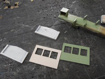 車体前頭部製作 ・積層プラ材を、車体に併せて、かつ写真を見ながら、 それらしく削っていきます。 |