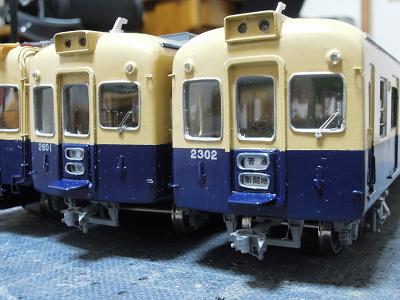 Hゴム表現 ・前回作の山陽3058FではHゴム表現にφ0.3mmの 真鍮線を考えましたが、密着性に問題あり、塗装 表現としました。 窓開口部に合わせて、プラセメントを用いて接着して いきますが密着性は中々いい感じです。 写真は先頭車の2302と2601の前面。 |