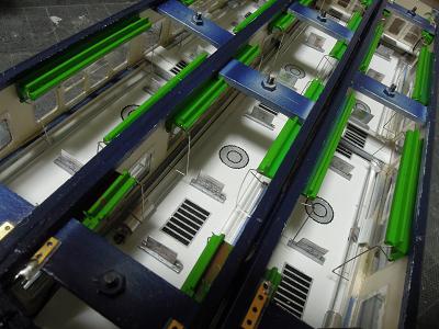 シート塗装 ・一方客席シートを塗装します。 GSIクレオスNo.6:グリーンに同No.4:黄色を調合して います。 |