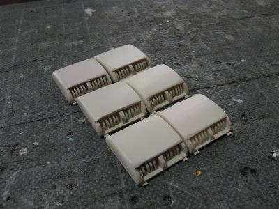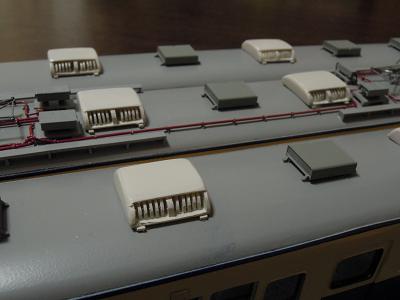 屋根上ベンチレータ類の実装 ・ベンチレータ類を実装します。 箱型ベンチレータはTOMIXの115系用を修理パーツ 購入しています。 |