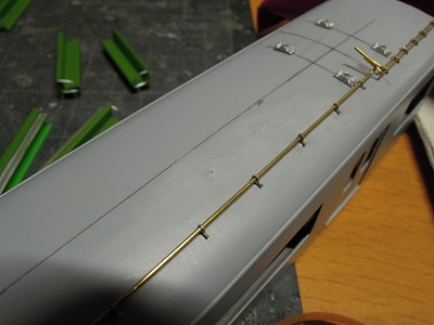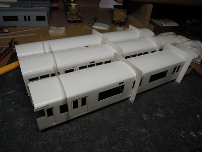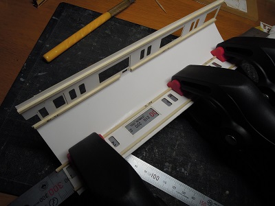 | ・車体箱組(2017/11/23) 妻面の雨樋も貼り付けていきます。 左の車両は気にしないでください。 |