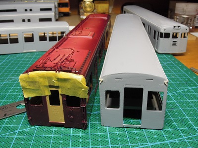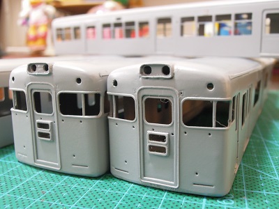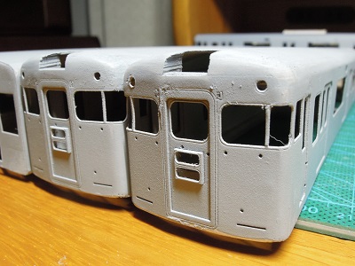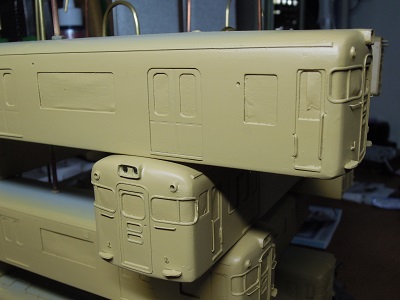 | ・車体箱組(2017/11/18) ライトケース周辺の隙間をパテで埋めつつ、#1000のサフェを 吹いて表面を仕上げていきます。 その後に、雨樋を取り付けていきます。 |