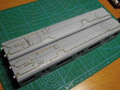 | ・屋根上配管(2018/1/30) 形式図のコピーを貼付けて、配管ルートと配管止め位置を 決め、屋根上配管を実装します。 今回の3020は手前になります。 ちなみに奥は冷改3次車です。 高圧配管はΦ0.6mm、その他電気系統はΦ0.4mmを、 空気配管系はΦ0.3mmの真鍮線を用いています。 |
