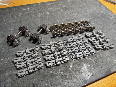 | ・車体組立(2018/2/25) 下廻りの塗装を進めておきます。 車輪と台車、ウエイト関連、そして床下機器類などを ニュートラルグレーで塗装しています。 |