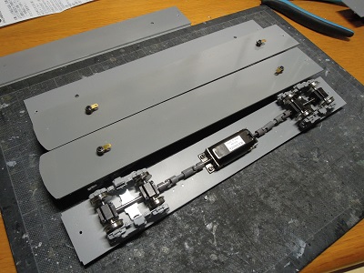 | ・車体組立(2018/2/25) 先に準備した床板に、塗装した台車とモーター類を取付ます。 |