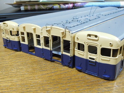 | ・車体組立(2018/3/25) 車体ブルーの後は、屋根にニュートラルグレーを吹いて、 車体色の塗装は完了。 細部の色入れ作業に移ります。 |