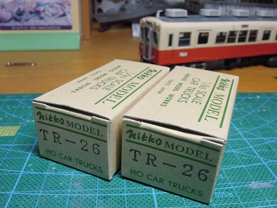 ・車体箱組(2020/8/7) 今回のクハ3001は、元ガソリンカーの台車を履いて いました。 よって、日光さんのTR-26を使用することにします。 |