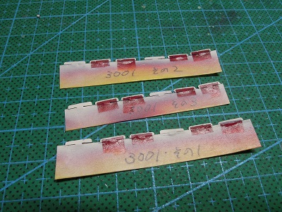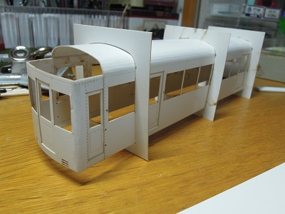 ・車体箱組(2020/8/30) 前面と側面を貼り合わせて箱状にします。 付属テンプレートで形状を癖付けします。 |