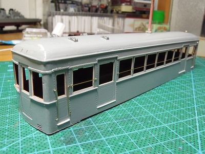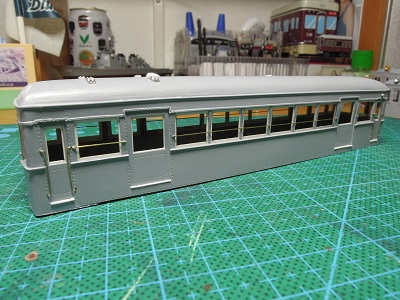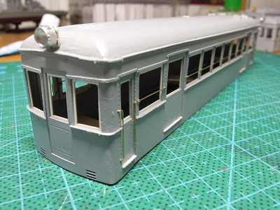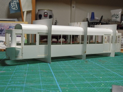 ・車体箱組(2020/11/22) おでこパーツを実装し、シルヘッダーを接着した後、 継ぎ目を消しつつ、サフェを吹いた状態。 客窓の保護棒と車体と同色となる窓サッシも取付け ました。 |