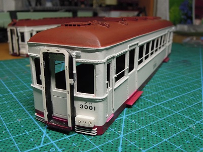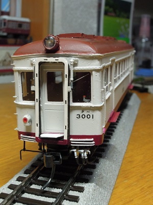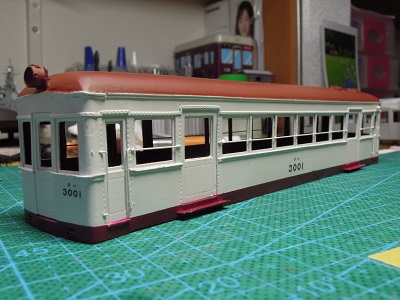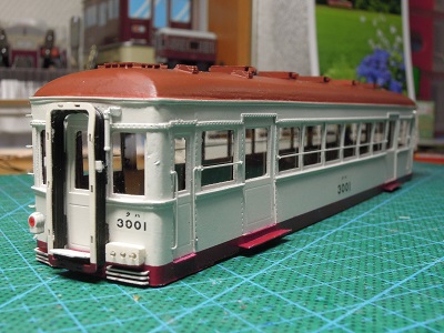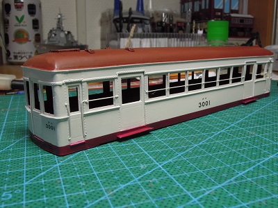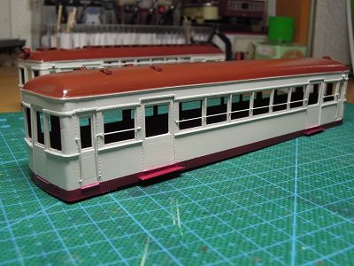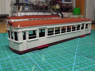 ・車体塗装(2020/12/6) 車体はGM28:アイボリーBを白で割ったものを、裾の マルーンはGSIクレオスNo.100:マルーンを使用して います。 写真は運転台撤去側。 |