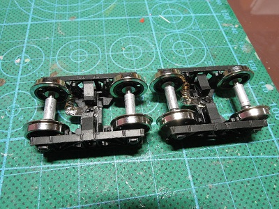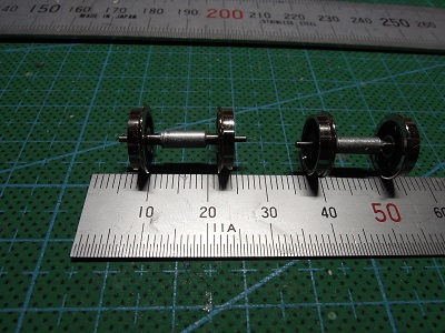 ・台車改軌(2020/12/31) 16.5mm車輪と比較すると幅が詰まっているのが 解ります。 |