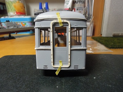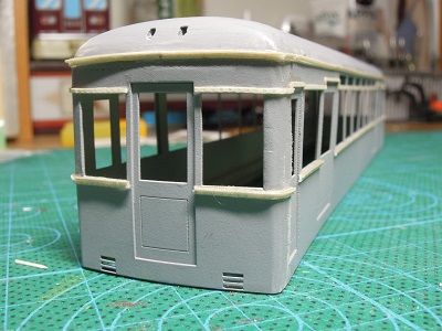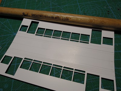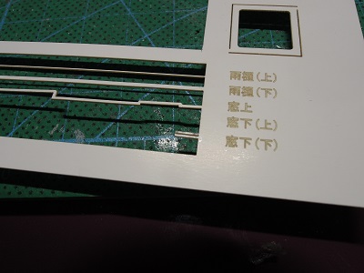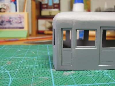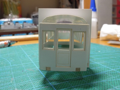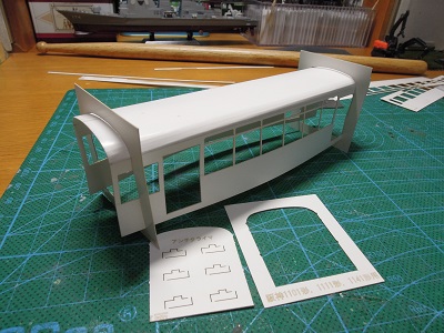 ・車体組立[試作版](2020/7/25~2020/7/26) 側面の明かり窓は、透明プラ板をペーパーで擦って すりガラス状にしました。 実車のガラスは唐草模様らしいです。 |