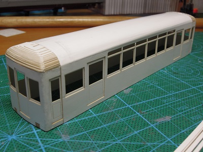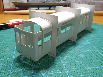 ・車体箱組[量産版](2020/7/15~2020/7/16) ここからは13mmの量産版。 シル、ヘッダーおよび雨樋を接着した状態。 |