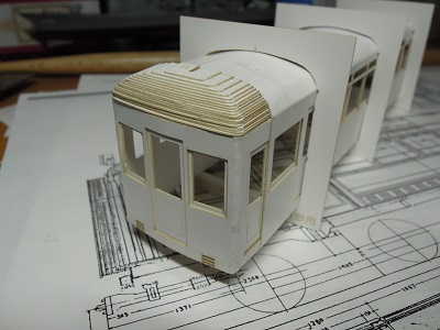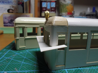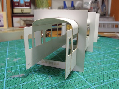 ・車体箱組[試作版](2020/6/20~2020/6./21) 肩R、および屋根Rを付けていきます。 特に肩の曲げ開始位置は、明かり窓上縁近くのため、 めくれ上がらない様に、注意深く曲げ癖を付けます。 |