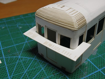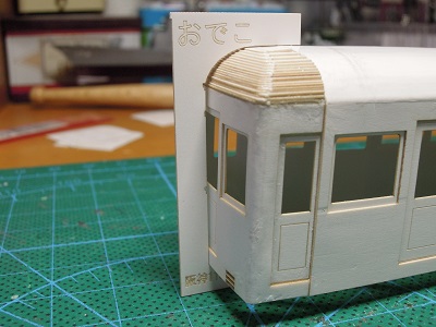 ・車体箱組[試作版](2020/6/20~2020/6./21) 車体に接着後、テンプレートに合わせ、接合面とおでこ部を 削って、段差をなくしていきます。 |