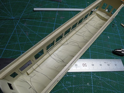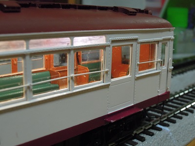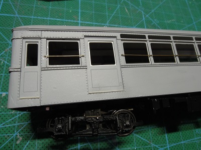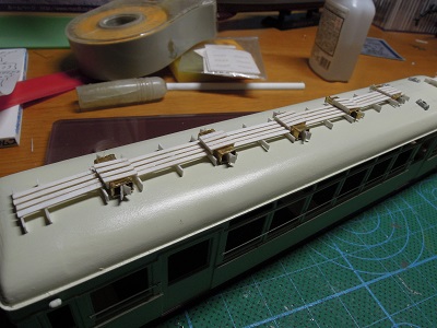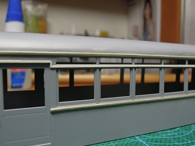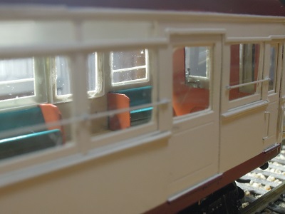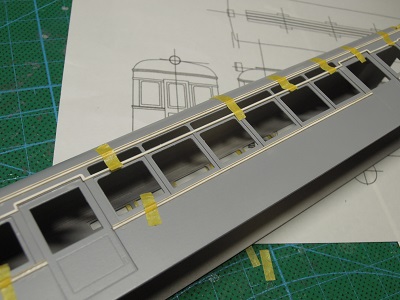 ・車体組立[試作版](2020/7/6) 客窓の保護棒を取り付けます。 Φ0.3mm洋白線を、線材を用いて窓柱に固定します。 |