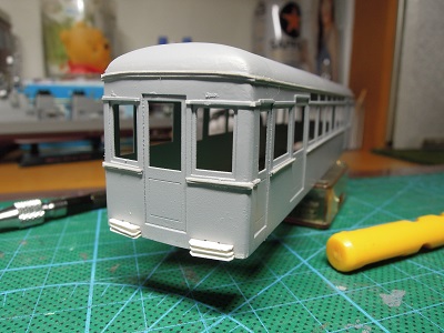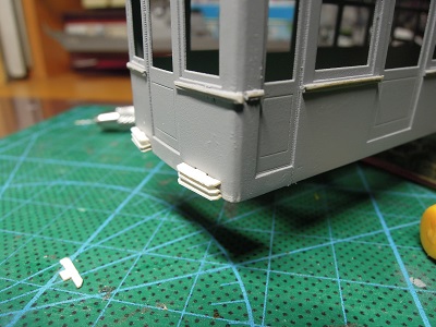 ・車体組立[試作版](2020/7/6) 保護棒に合わせて乗務員手すりなども取付完了。 |