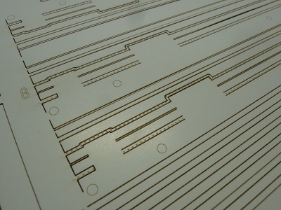 ・阪神1101形(1108,1109用)型紙[試作版] 素材は自作データ、レーザーカットしたものです。 ペーパールーフとし、表裏2枚貼合せる構造です。 写真は試作版でリベット表現は省略しています。 |