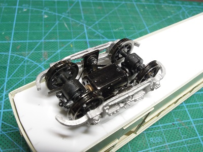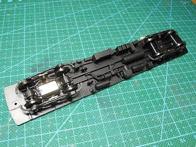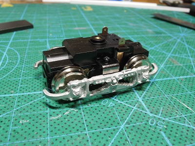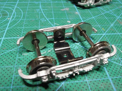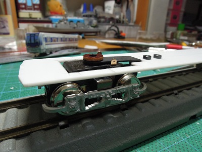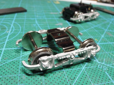 ・走行系組立[量産版](2020/7/10) 動力側台車のアップ。 こちらは、床板を切り抜く゚必要がありません。 |
