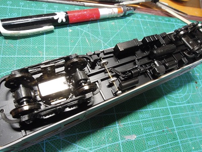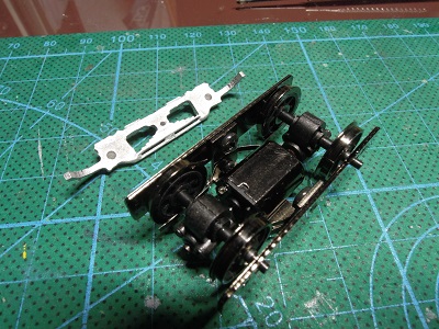 ・走行系組立[試作版](2020/7/6~2020/7/9) 動力側台車のアップ。 実装に際し、床板を切り抜いています。 |