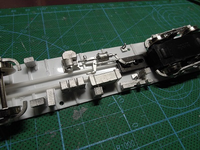 ・床板組立[試作版](2020/7/11) 抵抗器や制御器、コンプレッサーなどのパーツを 実車写真などから配置していきます。 >詳しくないので適当です。 |