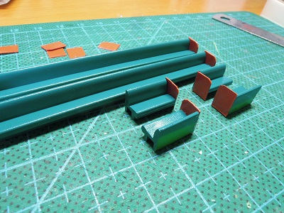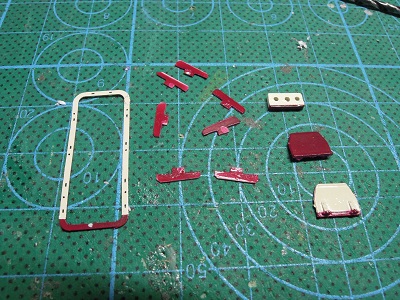 ・車体組立[試作版](2020/7/25~2020/7/26) 室内パーツ類の塗装します。 奥からシート仕切、客室仕切り、シートです。 |