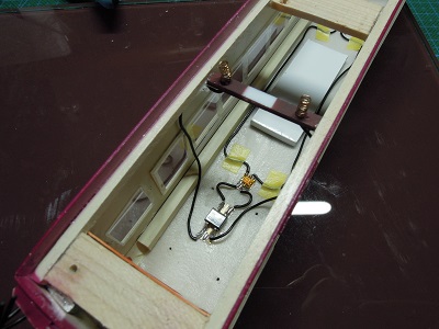 ・車体組立[試作版](2020/7/25~2020/7/26) 室内灯はチップLEDを2個実装しました。 ちなみに天井中央の白い物体は、パワトラに付属している ウエイトを接着しています。 |