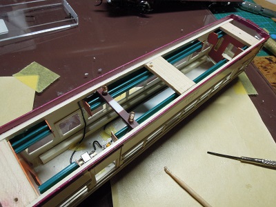 ・車体組立[試作版](2020/7/25~2020/7/26) 試作版は室内灯だけを点灯化します。 そのための集電端子を追加しました。 >ヘッド/テールライトの点灯化方法が詰め切れて いませんでした。 |