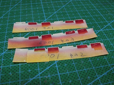 ・車体箱組[試作版](2020/6/20~2020/6./21) 写真は前面用です。 帯材の上に、細い線を接着しています。 |