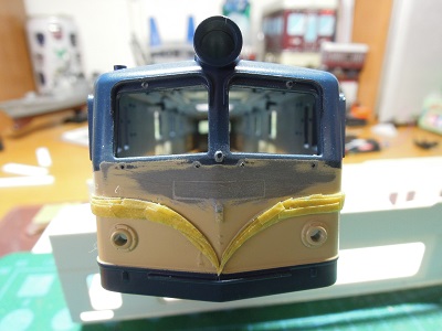 | ・車体塗装(2021/4/18) まず前面のクリームを吹いています。 塗料はGMのクリーム1号を使用しています。 また運転席に色差しを行っています。 |