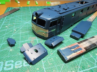 | ・屋根上ベンチレータ台加工(2021/4/6) 屋根上ベンチレータ台の線路方向長さを短縮します。 レザーソーで切って長さを詰めます。 |