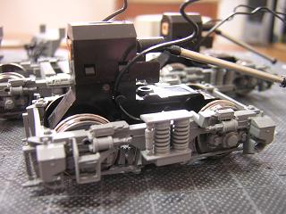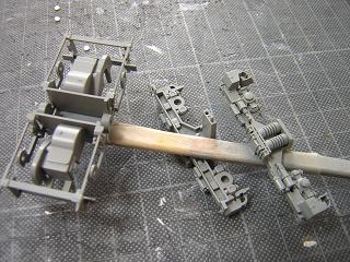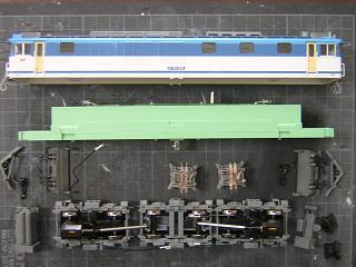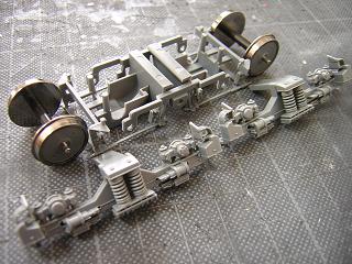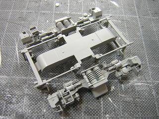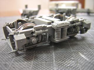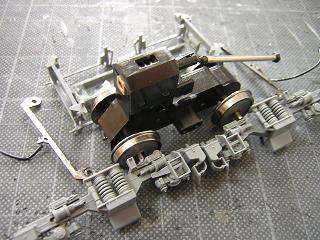 | 床下組立 動力台車も組立てます。 元々グリスが多用されていましたので、塗装に際し一旦拭き取り後、 台車枠の車軸部分にはエンドウのセラミックグリスを塗りこんで おきます。 (組立についてはEF64-1050号機製作記を参照願います。) |