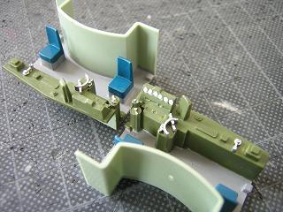 | 運転台塗装 車体を分解したついでに、運転台に色指しをしておきます。 運転台にはGSIクレオスNo.303:グリーンFS34102、シートはGM22: 小田急ブルーを、マスコン類にはGSIクレオスNo.8:銀を、メーターには GM37:白3号、床にはGM9:ねずみ1号を色差ししています。 (先に製作したEF64-1050と同じです) |