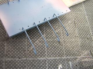 | 屋根上機器類塗装 屋根上機器のパンタグラフや避雷器、JR無線アンテナなどもメタル プライマーを吹いた後、床下と同じグレーを吹き付けます。 |