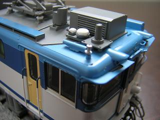 | 手摺塗装 前面窓下手摺はマッハカラー白を吹いた後、モリタのNo.570ディープ ブルーに、GSIクレオスのNo.34:スカイブルーを混ぜたものを吹き付けて います。 |