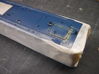 ・手摺取付 側面ステップや乗務員ドア上部の曲がった手摺も同様です。 この辺の手摺は小さい為、わざわざ真鍮線化しなくても、オリジナル パーツに塗料を塗るだけでも充分かと思います。 |