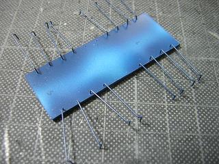 ・手摺塗装 乗務員ドア用の青系手摺の塗装準備です。 手摺保持用の治具(ってプラ板に穴あけただけ)を用意しました。 |