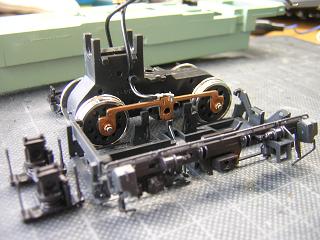 ・台車分解 紛失していた砂箱も実装しておきます。 枕ばね含め、ゴム系接着剤で固定しておきます。 |