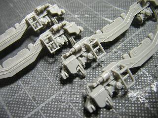 | ・床下塗装 GSIクレオスB-504メタルプライマーを一吹きした後、GSIクレオスの No.13:ニュートラルグレーを吹いています。 写真は動力台車のパーツ類。 |