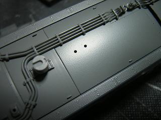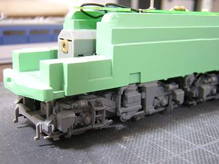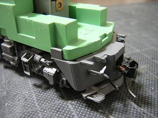 | ・スカート加工 ジャンパホース類も同時に塗装する為、先に実装しておきます。 なおJRF機ということでMRP管を取付けます。 取り付け穴は製品付属のテンプレートを用いて、Φ0.8mmのドリルで 貫通させます。 加工段階で、あらかじめスノウプロウとカプラーを取り外しています。 |