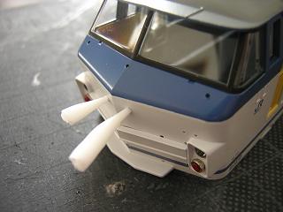 | ・前面手摺、パーツ類実装 前面の手摺類を実装します。また併せて付属パーツの取付けを 行います。 固定はゴム系接着剤を使用し、車体裏側にはみ出した分は ニッパーでカットしています。 |