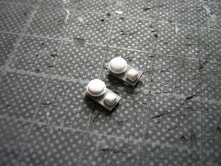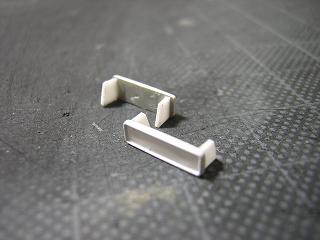 | ・車体加工(ナンバープレート) 先に加工したナンバープレート部に台座部を接着します。 台座部はt=0.5mmのプラ板を切り出して、プラ用セメントで接着して います。 |