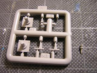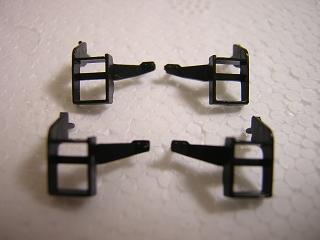 | 連結器開放てこ取付 てこの実装は、元々のパーつの取付部を利用します。 車体への差込部を切り出し、Φ0.4mmの穴を開けて、そこに今回 作成した真鍮線を通します。 写真上が付属の軟質プラパーツで、下が差込部を切り出し、 Φ0.4mmの穴を開けた状態。 |