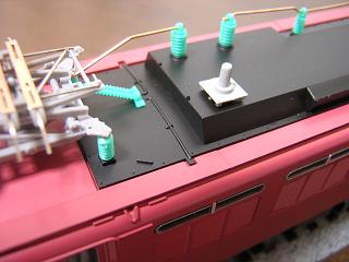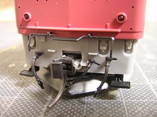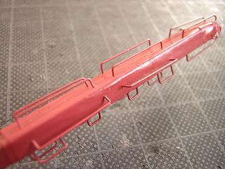 | ・手摺塗装 Φ0.4mmの真鍮線で製作した手摺を塗装します。 マッハのシールプライマーを吹いた後、同マッハカラーの No.4 交直車・EF80・81、471系・421系(ローズ)を吹き付けます。 同時進行の阪急7000系の下地塗装に合わせて行いました。 | |
