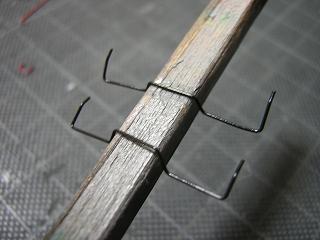 | ・手摺製作 Φ0.4mmの真鍮線を使用して手摺を製作します。 見本は製品の付属パーツ。 付属パーツに合わせて真鍮線を曲げていきます。 |