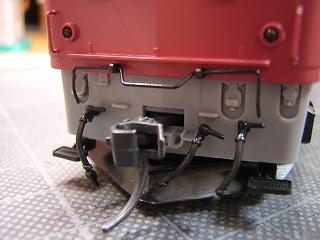 | 連結器開放てこ取付 車体に実装した状態。 若干傾いているようですが...。(^^;) 手で押さえて傾きを修正しておきます。 |
