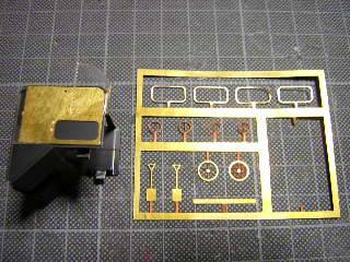 キャブ周辺 キャブ後方の雨樋は、製品パーツは太く感じましたので、φ0.5mmの 真鍮線で作り直しています。 製品パーツのキャブとの取付け座だけを切出して、φ0.5mmの穴を 開け、自作した配管を通します。 キャブ窓周りは、半光沢を吹く前に金を色差ししています。 |