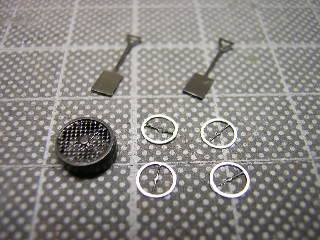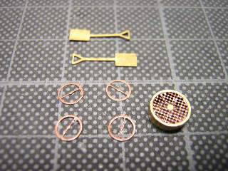 マッハのC56 160号機仕様パーツセットには、その他旋回窓や 火の粉止め、スコップなどのパーツが含まれていますので、 ついでに組立てました。 円形の網パーツに合わせて、帯材を丸く曲げて、瞬間接着剤で 固定します。 |