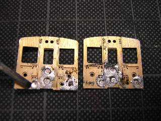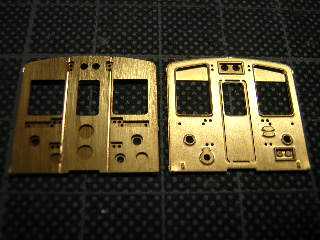 10)折り曲げると、この様になります。(左:裏側、右:表側) 裏板を折り曲げてはんだ付けします。 ★前面窓下の手すり(長)の取付け穴幅が0.5mm程度短い為、 この時点で左右両方とも外側に穴(φ0.4mm)を開け直した 方が良いでしょう。 今回は忘れていて、16)の工程でフォローする事になり ました。 |
